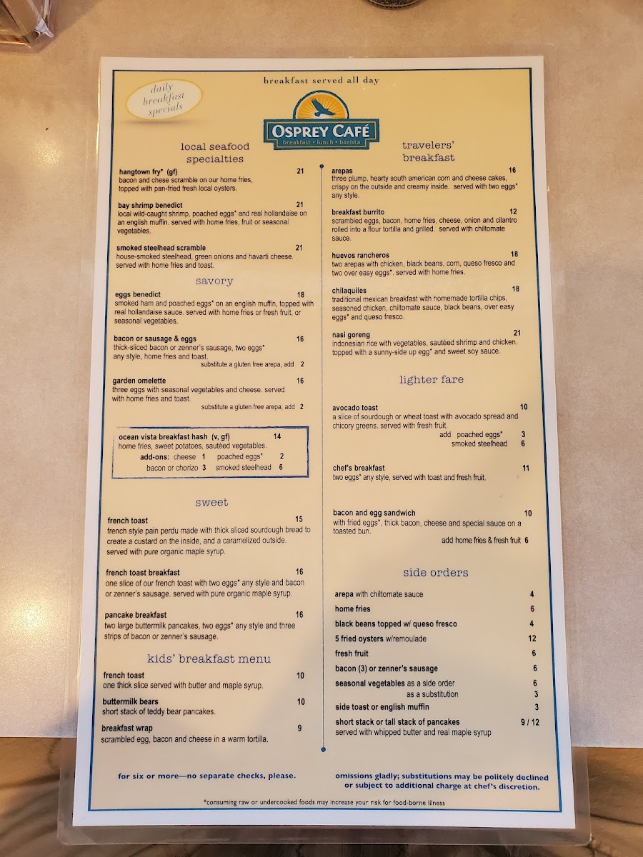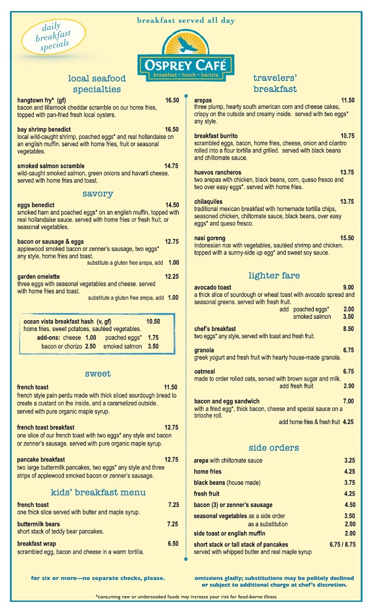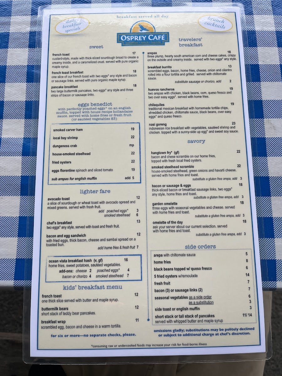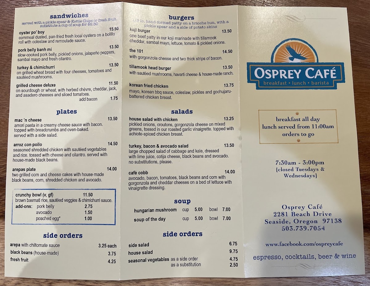 Welcome to Osprey Café, a charming gem nestled in Seaside, Oregon, where delightful flavors meet a warm atmosphere. The café's menu is a carefully curated mix of classic breakfasts and unique travelers' dishes, showcasing gluten-free options like the tantalizing Arepas and Eggs or Nasi Goreng. Highlights include the rich Crab Benedict and the popular smoked salmon scramble, both praised for their quality and taste. For lighter fare, the Avocado Toast and Chef's Breakfast offer a delightful twist. Osprey Café focuses on locally sourced seasonal vegetables, adding freshness to each dish.