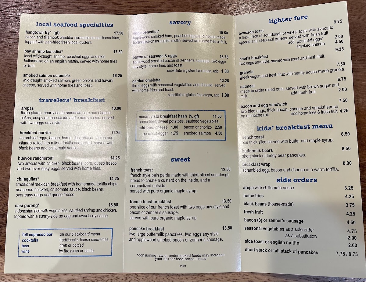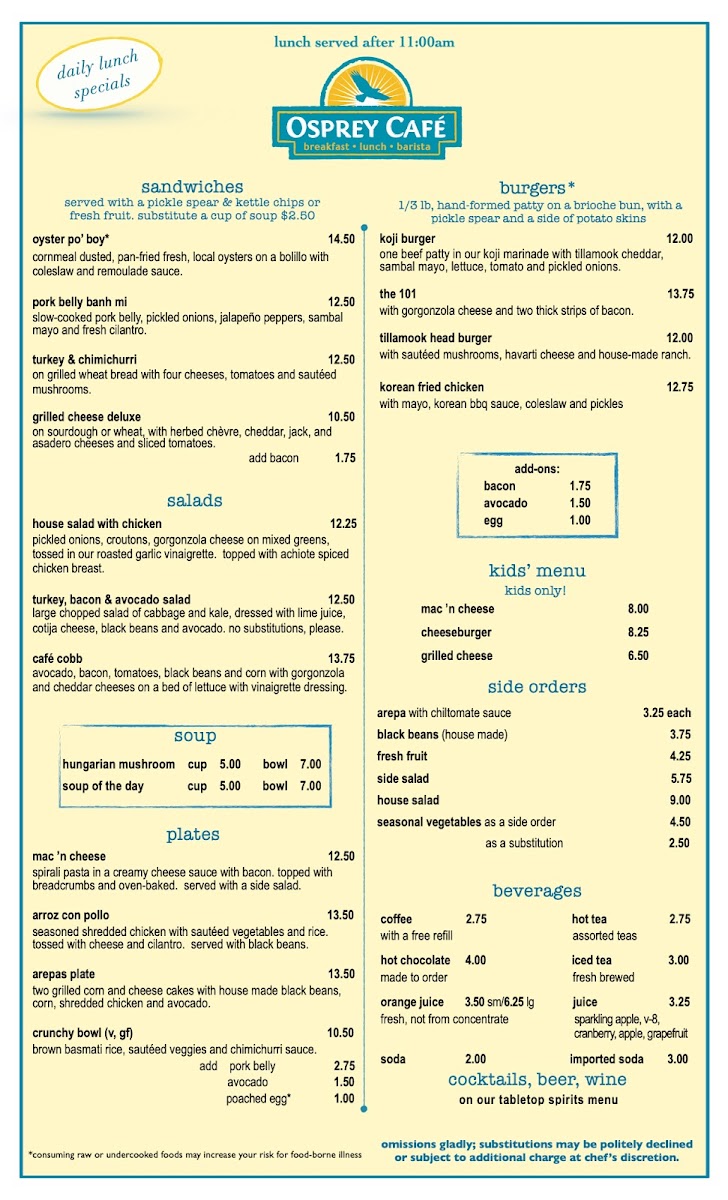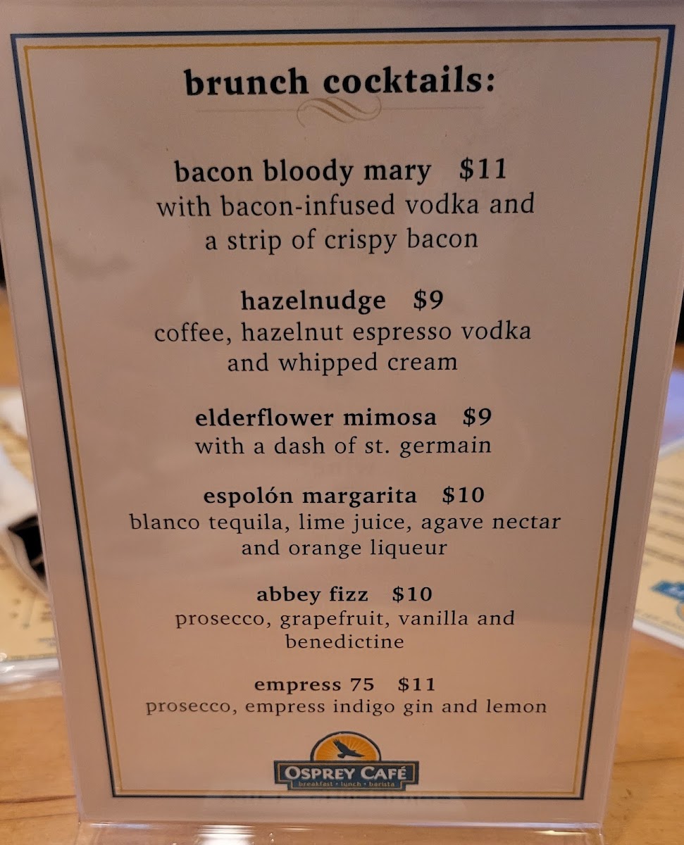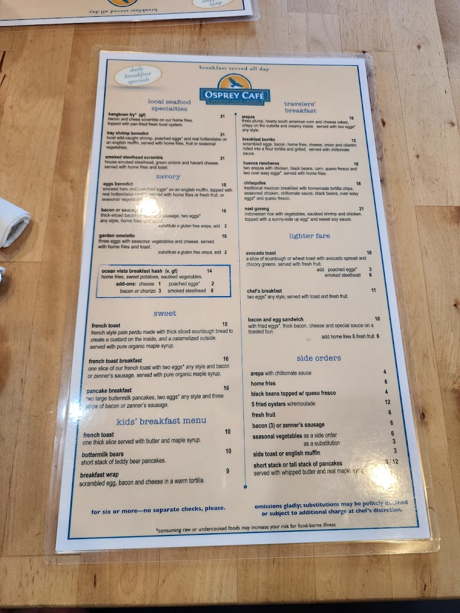 Welcome to Osprey Café, a charming gem nestled in Seaside, Oregon, where delightful flavors meet a warm atmosphere. The café's menu is a carefully curated mix of classic breakfasts and unique travelers' dishes, showcasing gluten-free options like the tantalizing Arepas and Eggs or Nasi Goreng. Highlights include the rich Crab Benedict and the popular smoked salmon scramble, both praised for their quality and taste. For lighter fare, the Avocado Toast and Chef's Breakfast offer a delightful twist. Osprey Café focuses on locally sourced seasonal vegetables, adding freshness to each dish.